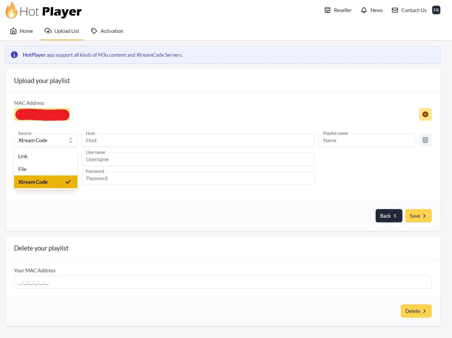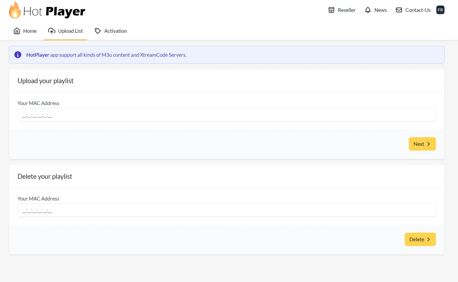 Step 2: Visit https://hotplayer.app/upload, and enter your MAC address in the “Your MAC Address” field under the “Upload your playlist” tab. Then, click Next.