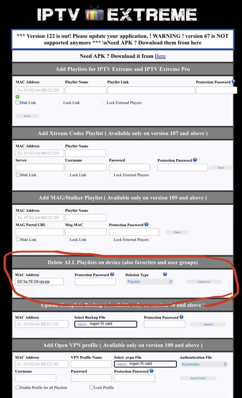 Step 2: Visit https://iptvextreme.eu/, and first delete any existing playlists, even if they aren’t active. Enter your MAC address under “Delete All Playlists” and press “Delete All” under “Playlists and VPN Profiles”.