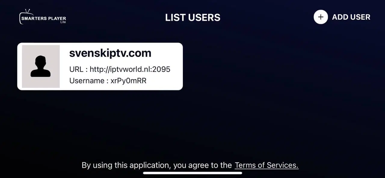 Step 1: Launch the app and enter the details provided in the email you received. In the Playlist Name field (or at the top), type svenskiptv.com, then press Add User.