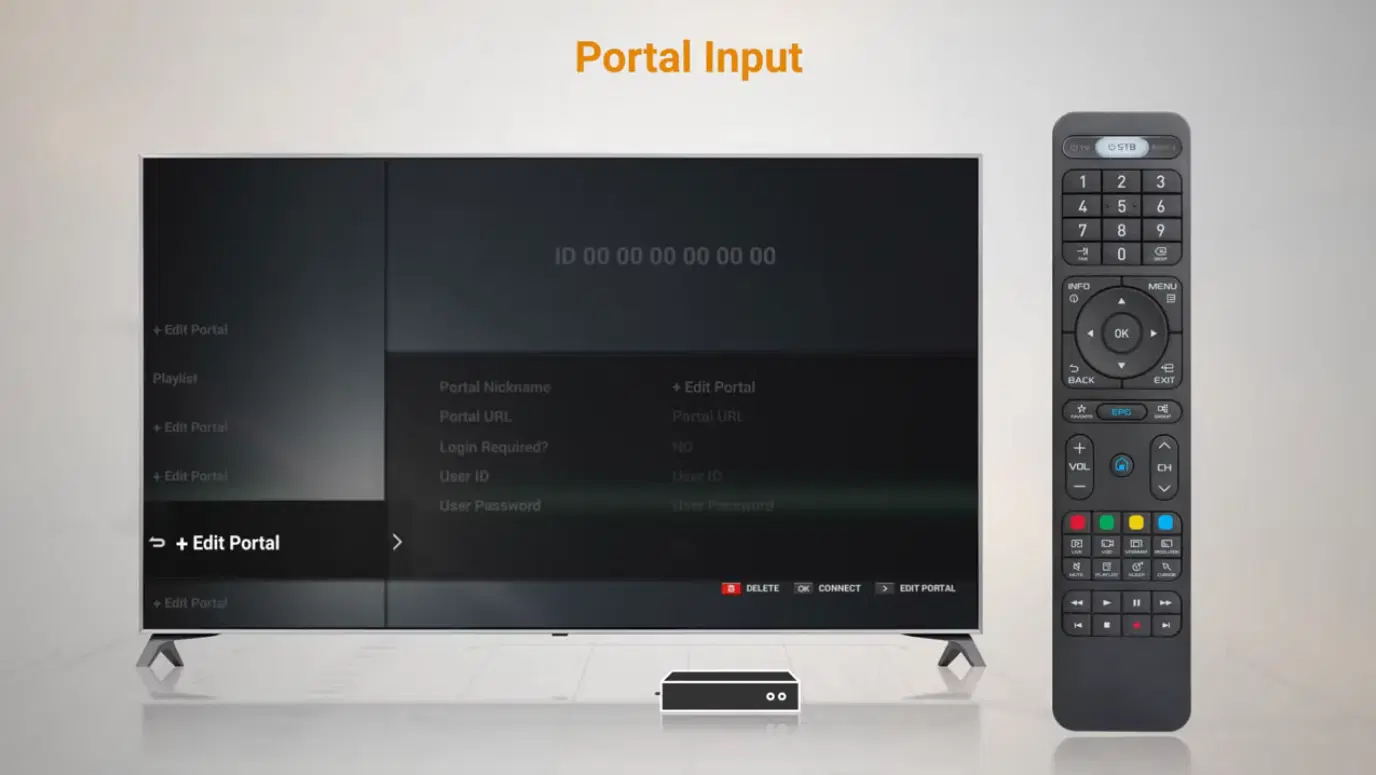 Step 2: Enter Portal Details; Fill in the Portal URL you received via email. After entering the details, press OK on your remote to save. If you haven’t already, place an order and provide your Box ID (found in the settings or at the bottom of your device) to complete the setup.