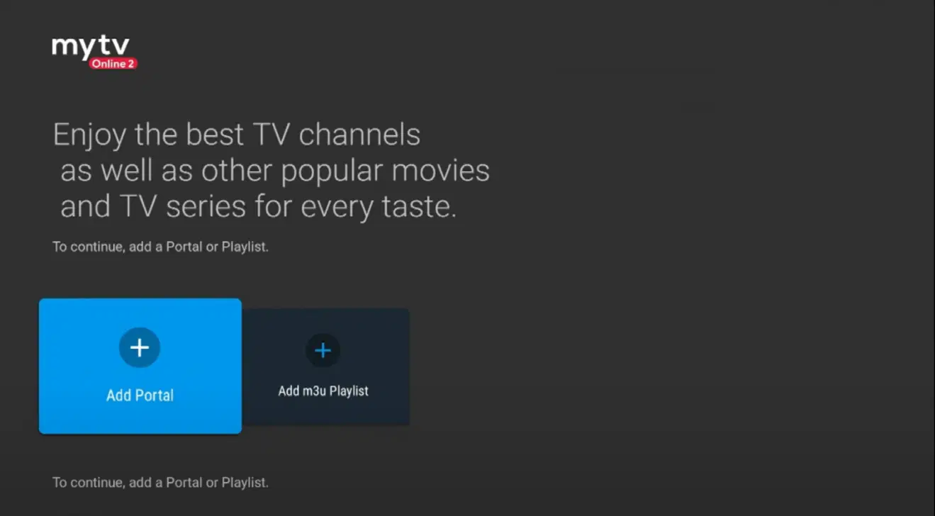 Step 1: Open the App; Turn on your box and launch the MyTVOnline2 app. From the main menu, select Add Portal to begin the setup.