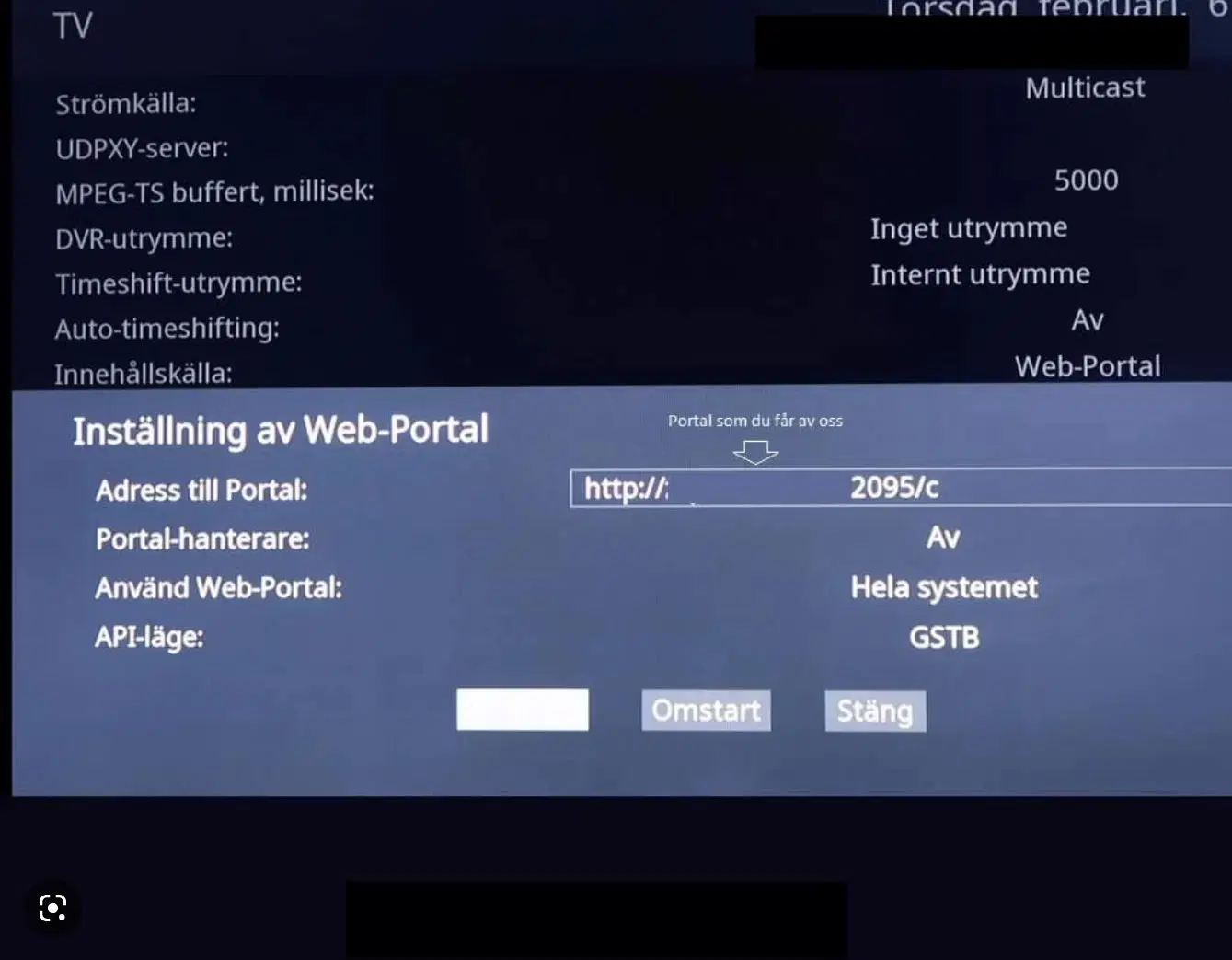 Power on your TVIP box and your TV. Accept any terms and conditions displayed on the screen. Locate the Portal URL provided in your IPTV service email (e.g., http://abcd.se:3095/c). Enter this URL in the setup field.